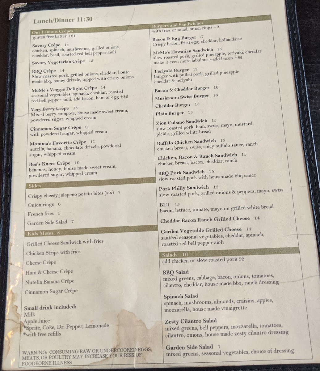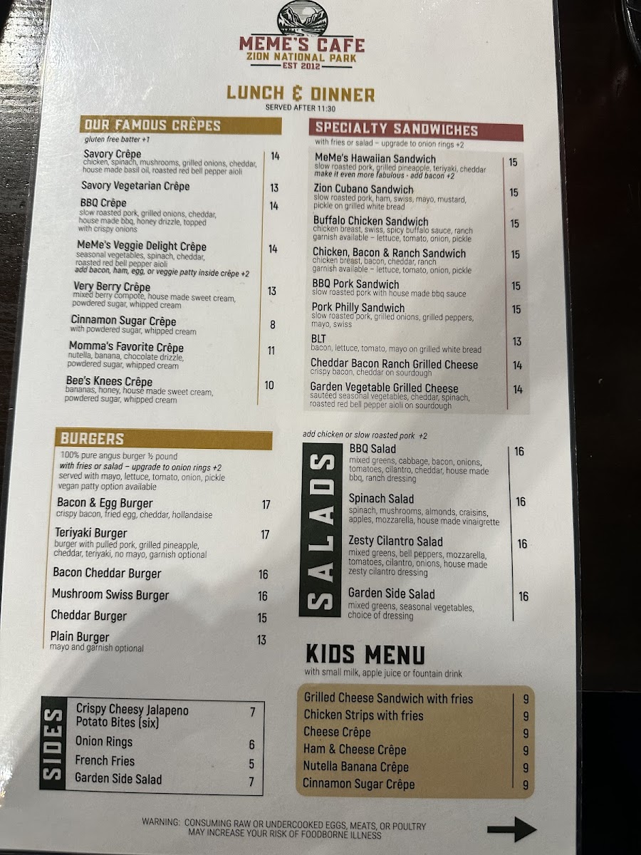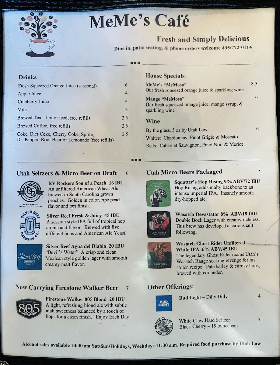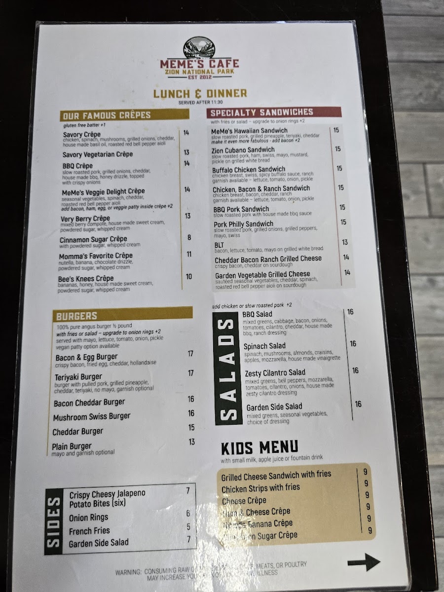 Welcome to MeMe's Café, your ultimate dining destination nestled in the picturesque town of Springdale, just a stone's throw away from the awe-inspiring Zion National Park. This charming café boasts a delightful fusion of flavors and a welcoming atmosphere that perfectly complements the scenic backdrop of Southern Utah. Whether you’re fueling up before a day of hiking or seeking a cozy spot to unwind, MeMe's Café offers an inviting escape with a menu bursting with mouthwatering options.